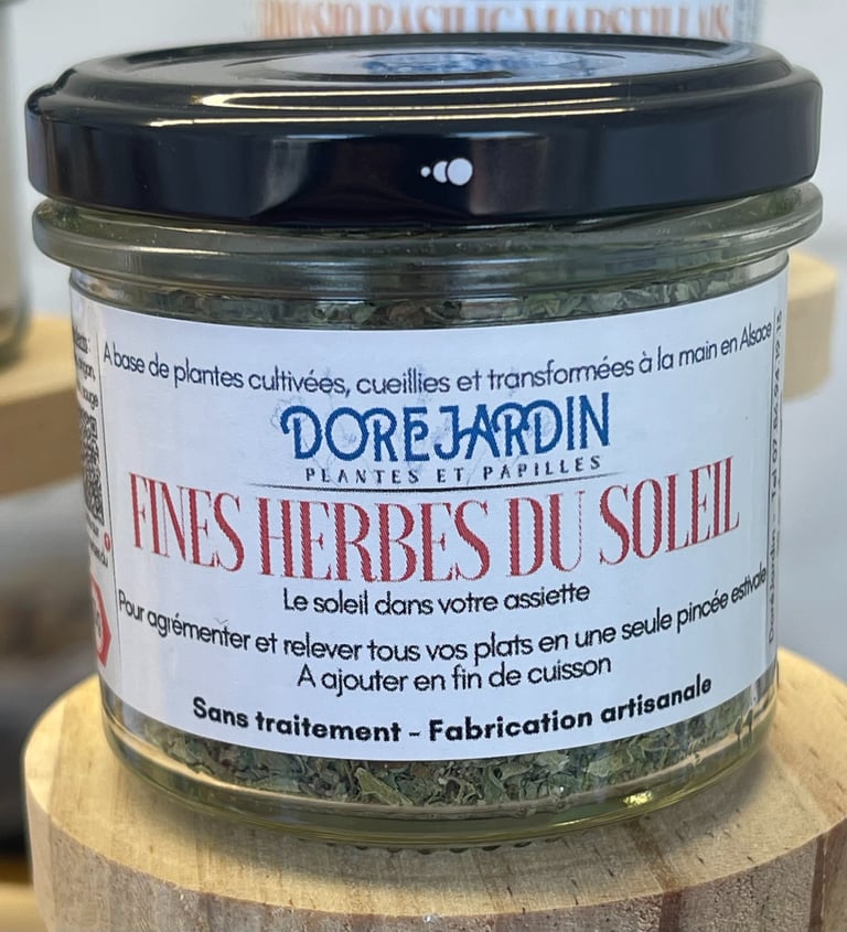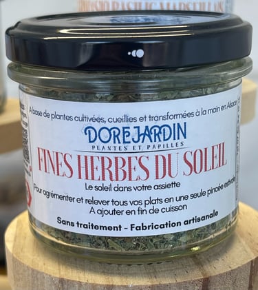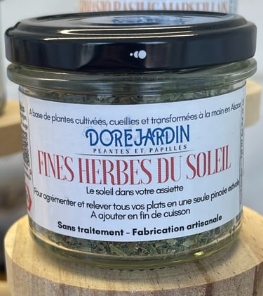 Cultivées avec amour dans mon jardin, les Fines Herbes du Soleil sont de véritables trésors aromatiques. Bercées par la lumière, nourries par la terre et le temps, elles offrent un goût intense et une saveur authentique. Chaque pincée libère des parfums qui éveillent vos sens et subliment vos plats. Expérience gourmande simple et vraie assurée.