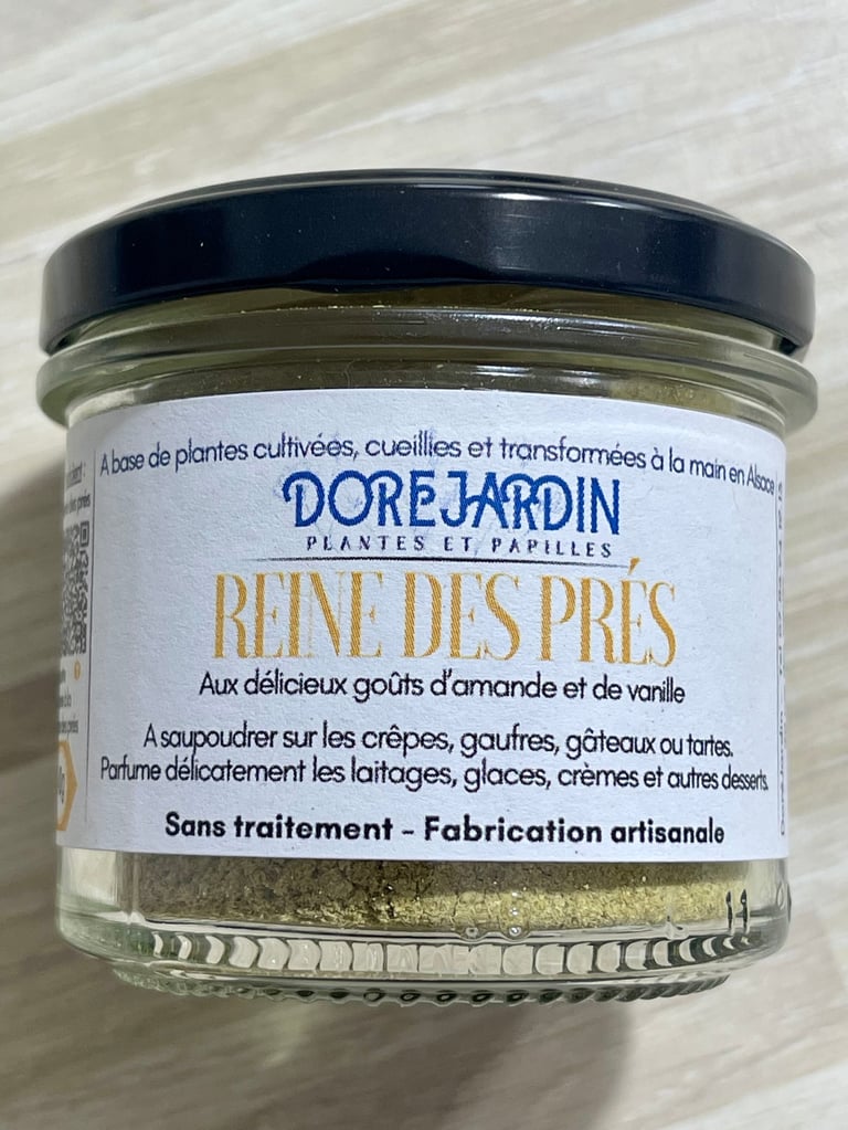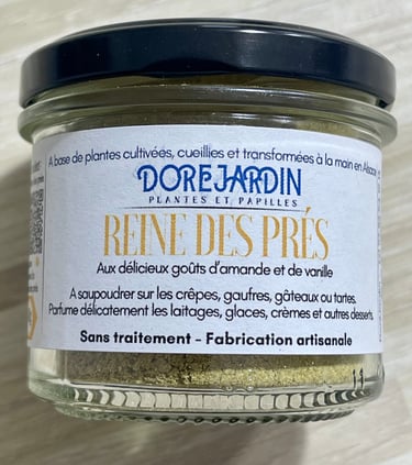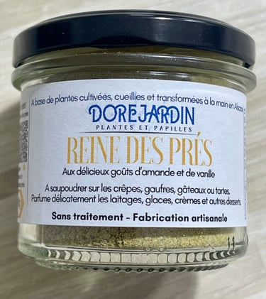 Délicate et parfumée, la reine des prés est une plante sauvage emblématique des prairies humides. Récoltée avec soin puis finement réduite en poudre, elle révèle des notes d'amande et de vanille. Elle se saupoudre sur les crêpes, les gâteaux, les compotes et se mélange dans les laitages et les crèmes. Une place de choix dans tous vos desserts