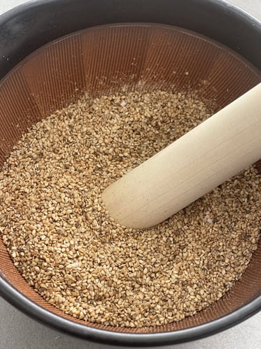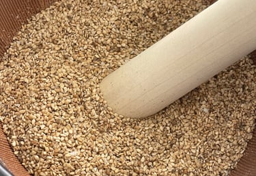 Les graines de sésame sont broyées à l'aide d'un suribachi, mortier strié japonais, et d'un pilon, afin de garder l'aspect traditionnel du gomasio