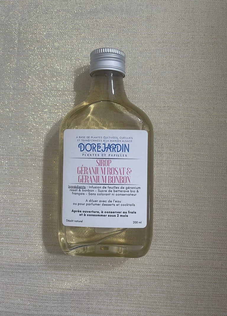 Sirop au double parfum floral de géranium. Une petite douceur florale dans la bouche accompagnée d'un goût de bonbon