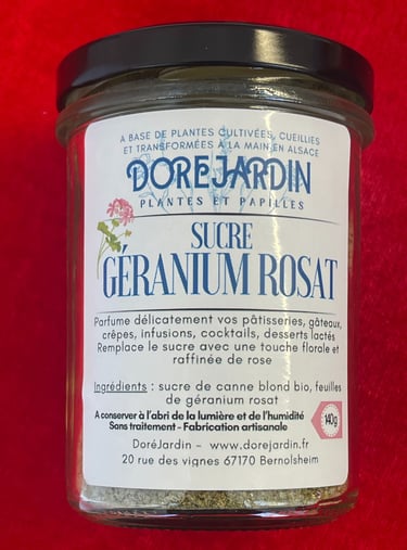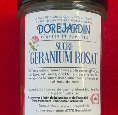 Laissez-vous séduire par la délicatesse du sucre au géranium rosat, un sucre parfumé naturellement aux notes florales et légèrement citronnées. Récolté avec soin dans mon jardin, le géranium rosat apporte une fraîcheur subtile et élégante qui transforme chaque dégustation en instant raffiné. Idéal pour parfumer tisanes, yaourts, desserts lactés, pâtisseries, crêpes ou fruits frais, ce sucre artisanal sublime vos recettes au quotidien comme vos créations les plus gourmandes.