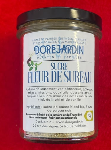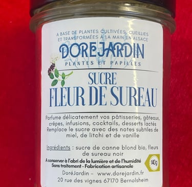 Récoltées à la belle saison, les fleurs de sureau offrent à ce sucre une note raffinée et délicate. Idéal pour sublimer tisanes, pâtisseries, crêpes, desserts lactés et gourmandises maison. Une invitation à la douceur, parfaite pour les moments sucrés du quotidien : le goût du printemps en une cueillère .