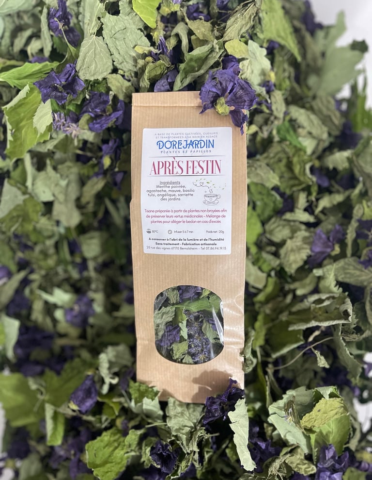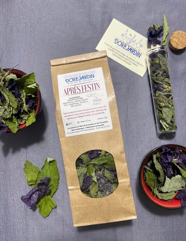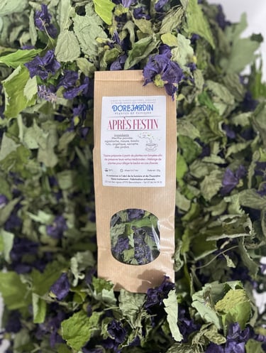 Composition : Menthe poivrée, agastache, mauve, basilic tulsi, sarriette des jardins