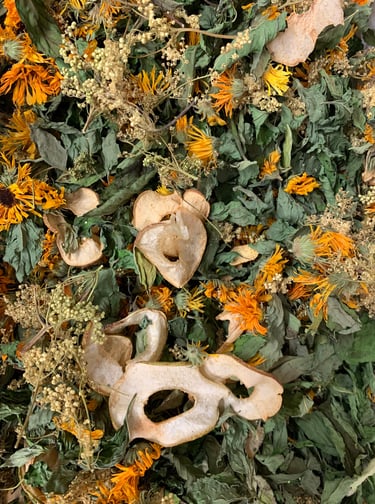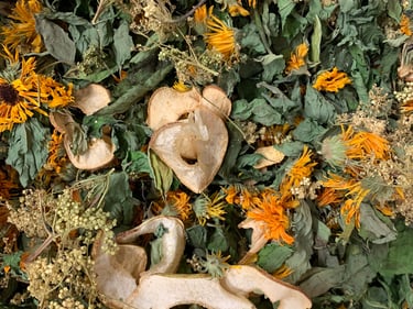 Composition : Menthe bergamote, menthe orange, reine des prés, calendula, basilic cannelle, écorce d'orange bio, pomme séchée (*)