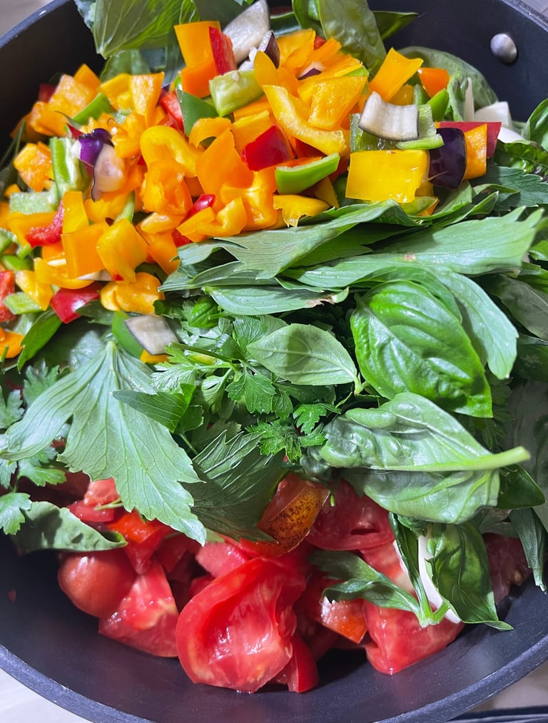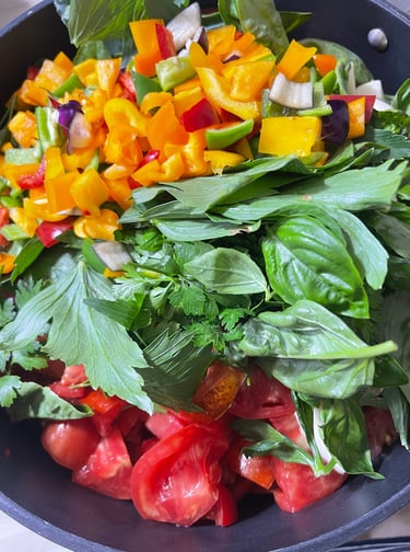 Ingrédients : Tomates bien mûres, courgettes, oignons jaunes, poivrons violets, rouges, oranges et jaunes, basilic Grand Vert, ail, persil, branches de céleri, livèche, feuilles de laurier