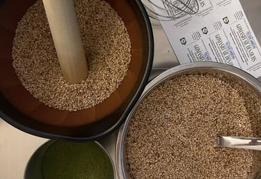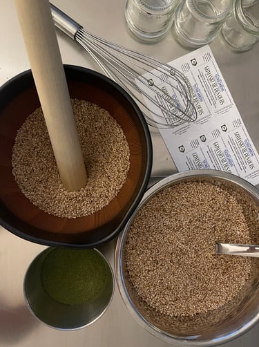 Les graines de sésame sont broyées à l'aide d'un suribachi, mortier strié japonais, et d'un pilon, afin de garder l'aspect traditionnel du gomasio